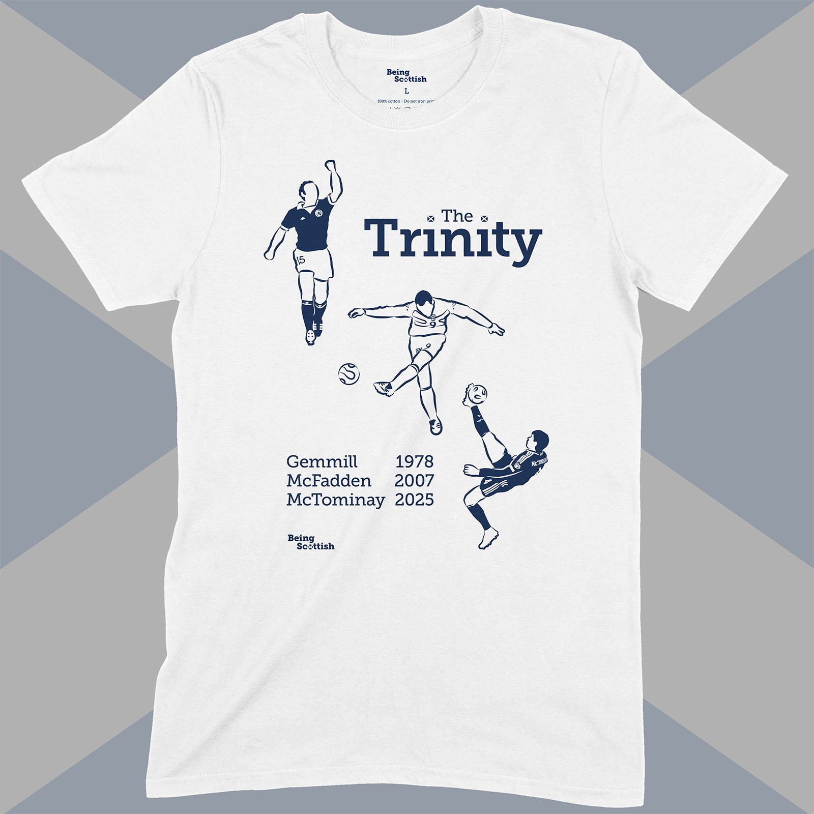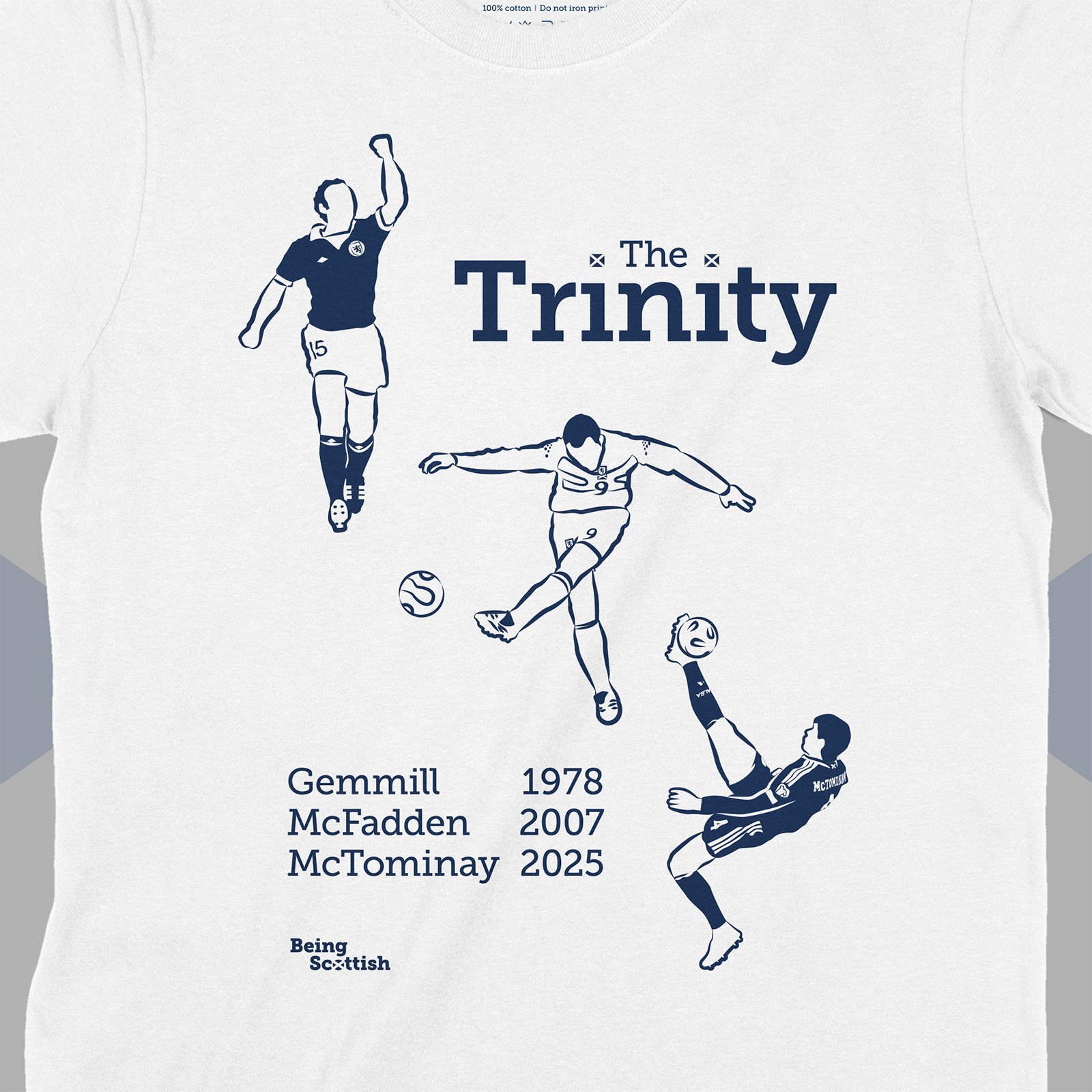 Three of Scotland's most memorable goals captured on this cracking T-shirt. The Trinity – Gemmill's legendary solo goal in Argentina 1978, McFadden's wonder strike in France in 2007 and McTominay's acrobatic overhead kick last year at Hampden.